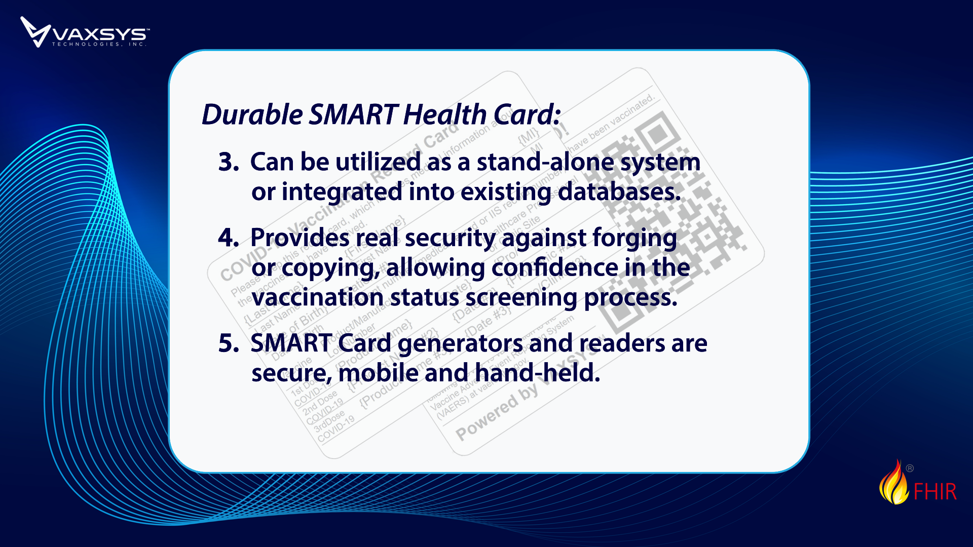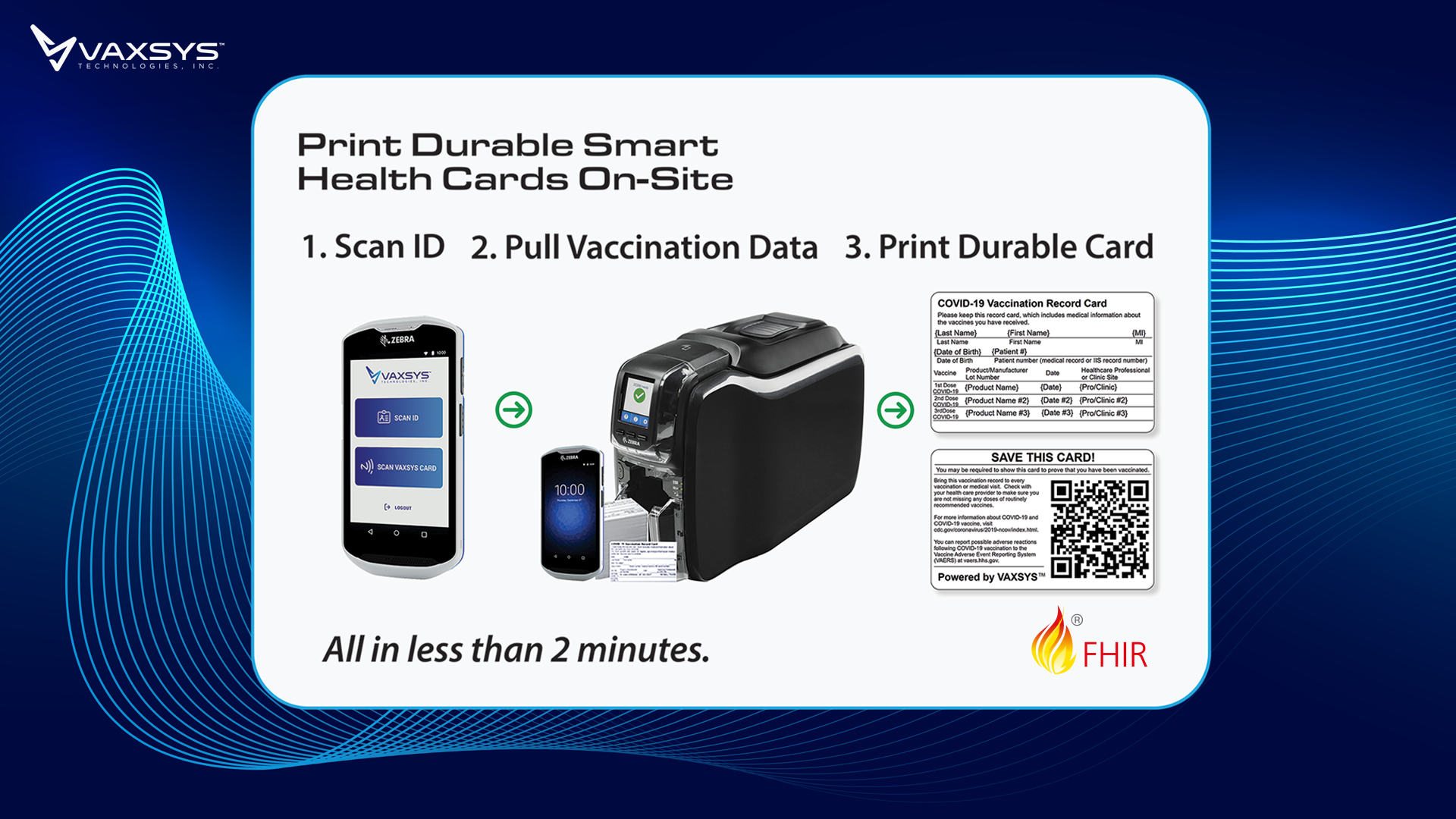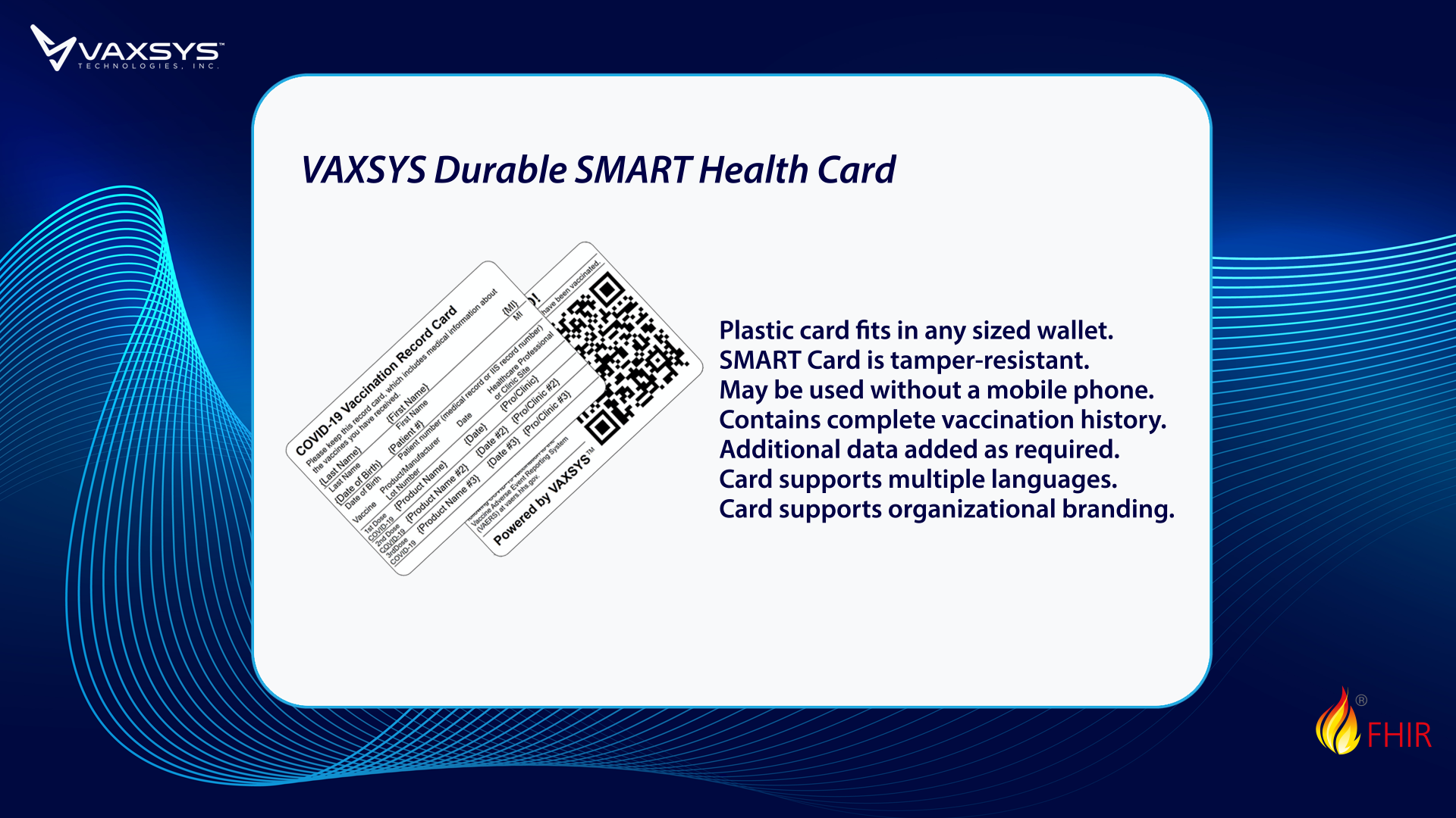 The VAXSYS® Durable SMART™ Health Card System employs key technologies to ensure that the card issuing process is quick, easy to use, accurate and secure. Paramount to the system is vendor 'ease of use.' On site, participants may be enrolled, key medical records integrated via SMART Links, and a personalized durable SMART Health Card printed–all in about 5 minutes. The participant's card may then be read at any location using any SMART Health Card reading App on the App Store or Google Play Store.