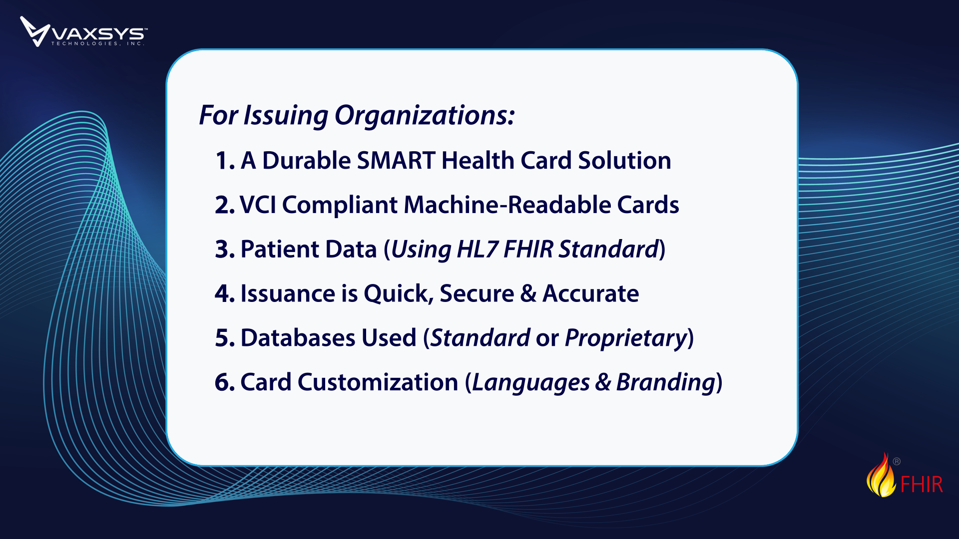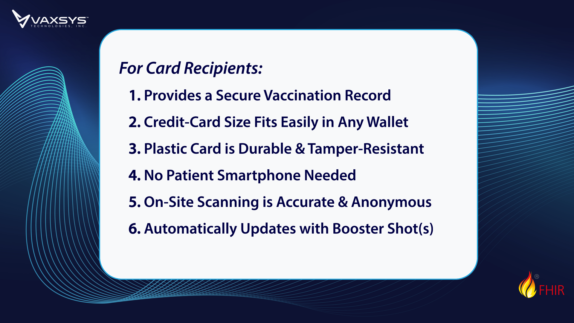 The VAXSYS Durable SMART Health Card System is flexible and dynamic. It’s designed to connect to various EHR’s and health systems using HL7 FHIR standards, allowing patients to obtain portable and verifiable proof of vaccination, in addition to links to critical healthcare data they may want to carry. Cards can be printed in real time, while patient’s wait, in about 2 minutes. Alternatively, cards can be created and mailed to larger populations via VAXSYS’s web-based tools, and a corresponding high-volume printer located at an issuer’s central location.
