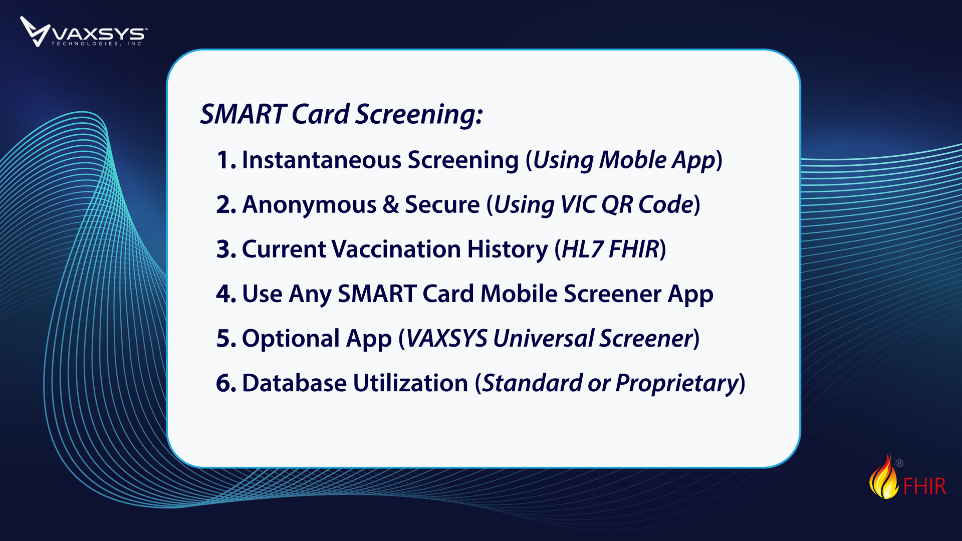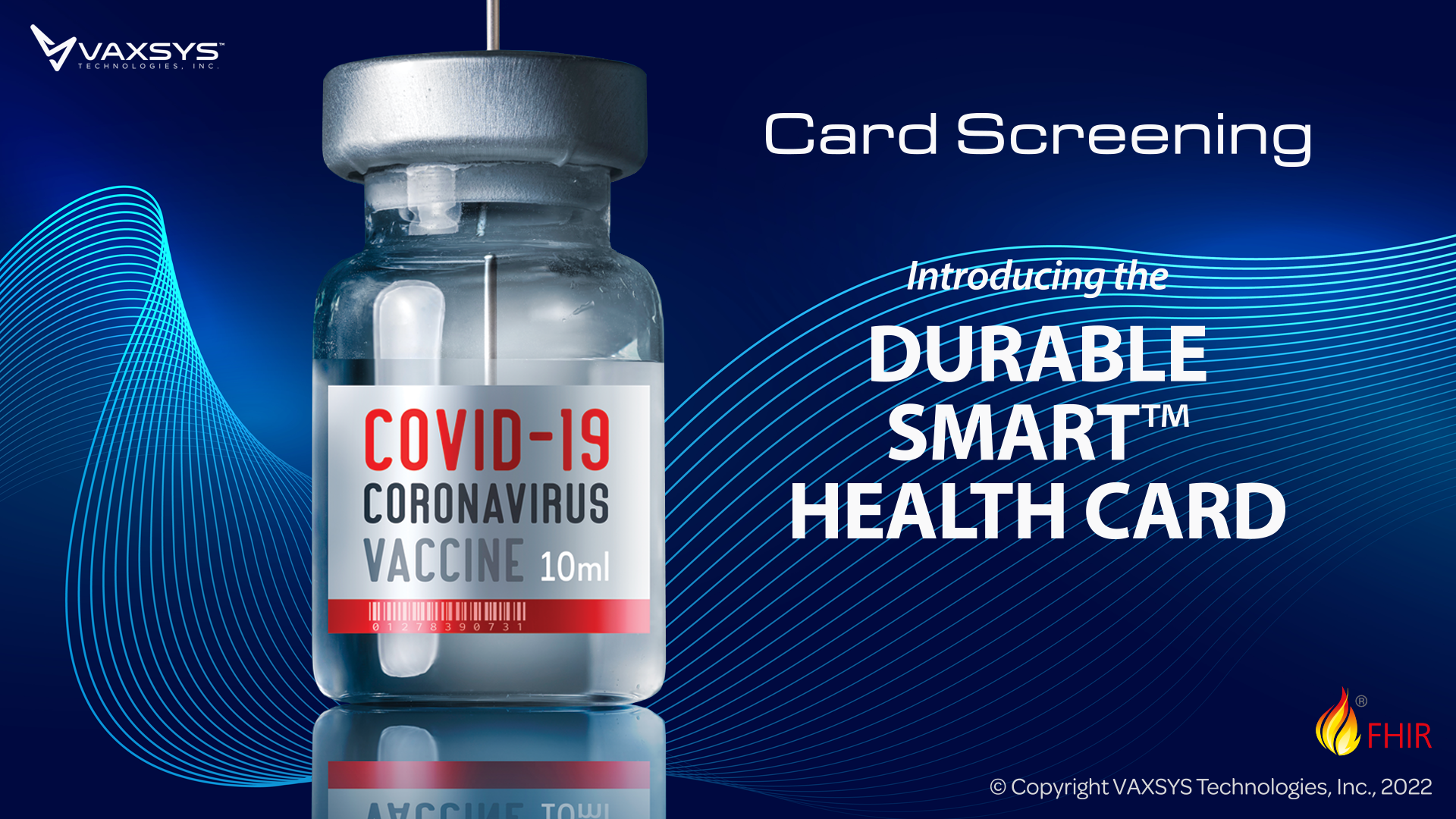 The VAXSYS® Durable SMART™ Health Card System employs key technologies to ensure that the card issuing process is quick, easy to use, accurate and secure. Paramount to the system is vendor 'ease of use.' On site, participants may be enrolled, key medical records integrated via SMART Links, and a personalized durable SMART Health Card printed–all in about 5 minutes. The participant's card may then be read at any location using any SMART Health Card reading App on the App Store or Google Play Store.